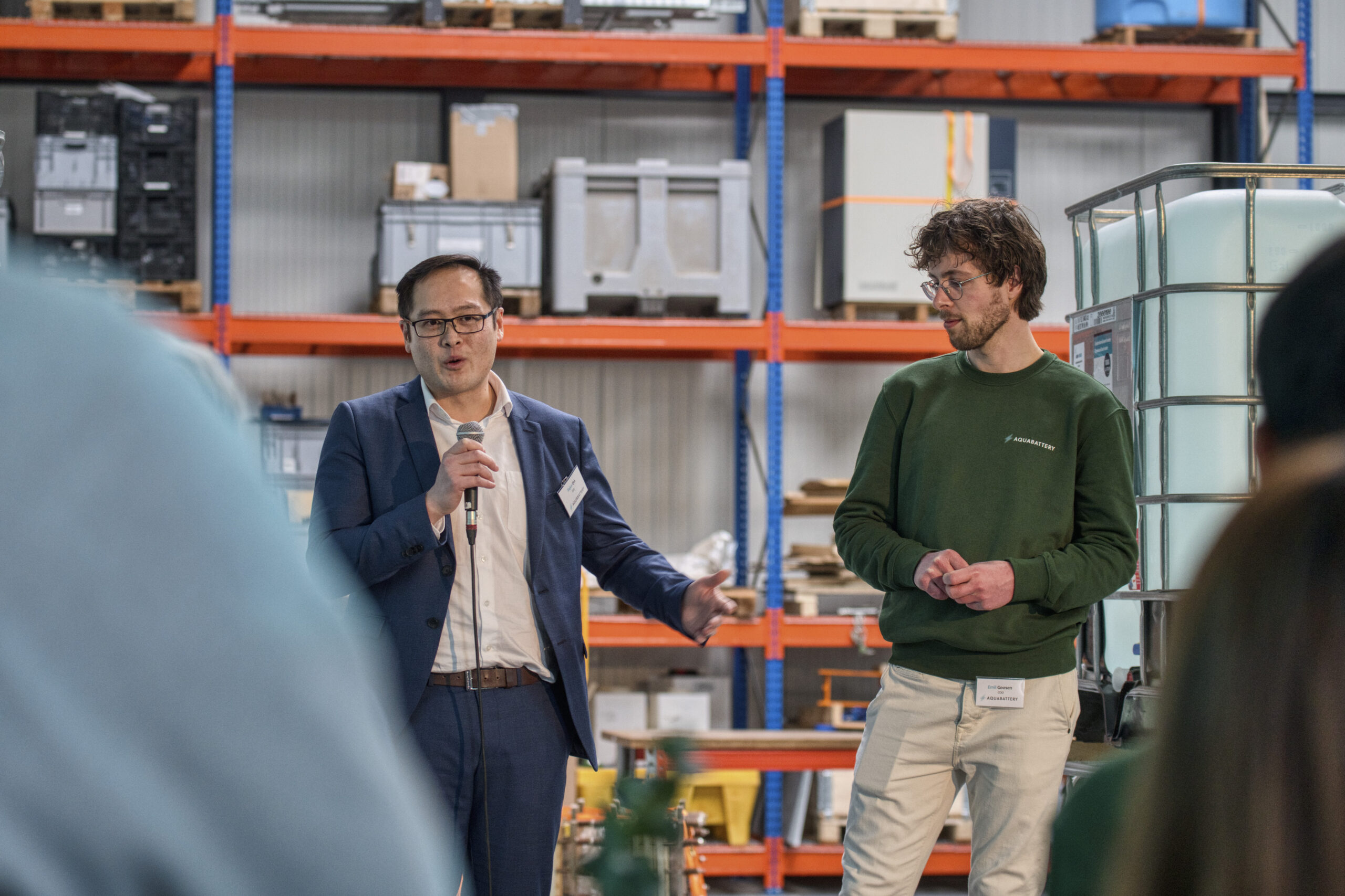 AQUABATTERY ontwikkelt een nieuwe flowbatterij die gedurende 8+ uur duurzame elektriciteit kan opslaan in keukenzout en water. Bij het opladen zet de batterij zout water om in zuur en base en keert het proces om bij ontlading. De startup bereidt zich voor op de lancering van zijn vierde pilot batterij in Delft later dit najaar.