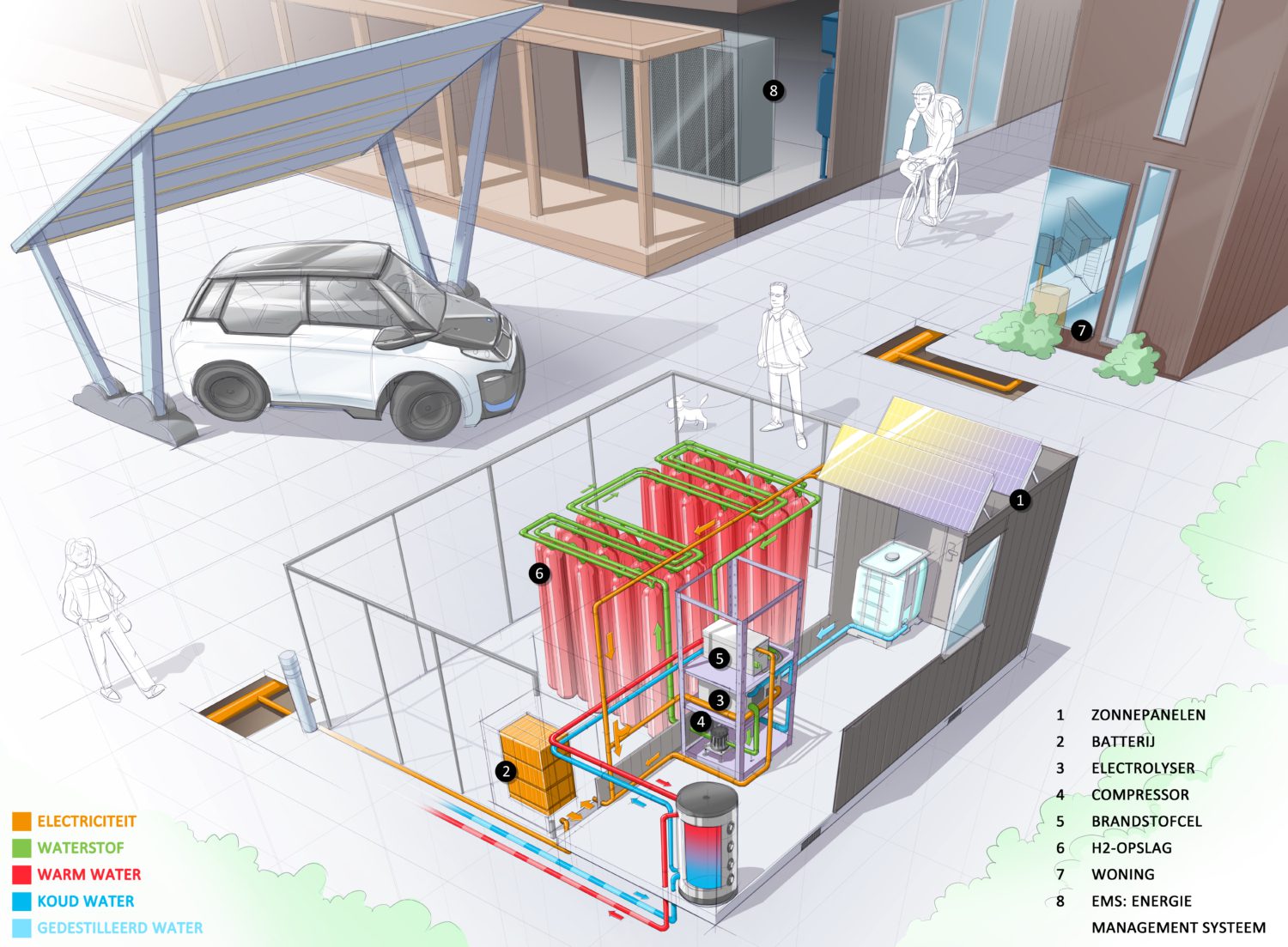 The 24/7 Energy Hub project has established a complete system, incorporating all necessary components for an off-grid energy system. This includes an electrolyser, solar panels, hydrogen storage, a combustion engine, batteries, an energy management system and actual users. This full cycle must function flawlessly together to provide buildings with 24/7 green energy. The current prototype is being optimized and scaled up for the entire Green Village. In parallel, a feasibility and impact study is being conducted on the scale-up possibilities for the campus.