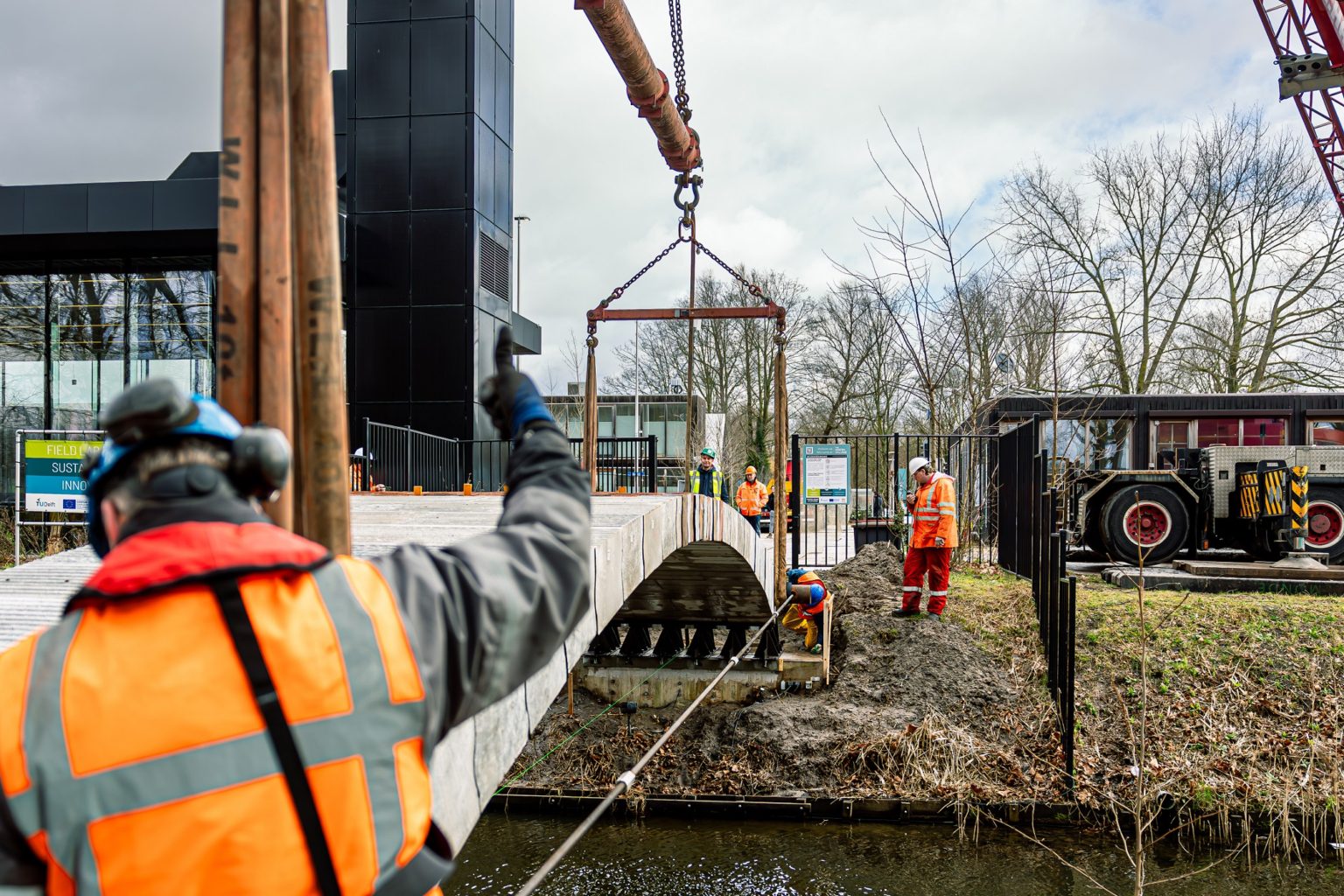 A new bridge has been constructed between Mekelpark and The Green Village using waste materials such as discarded toilet bowls, other ceramics, and residual concrete. The bridge features a modular design and can be easily disassembled, as no adhesive has been used to secure the elements. The uniquely designed structure is currently undergoing tests to assess its performance under various weather conditions and seasonal changes, and it is being closely monitored.