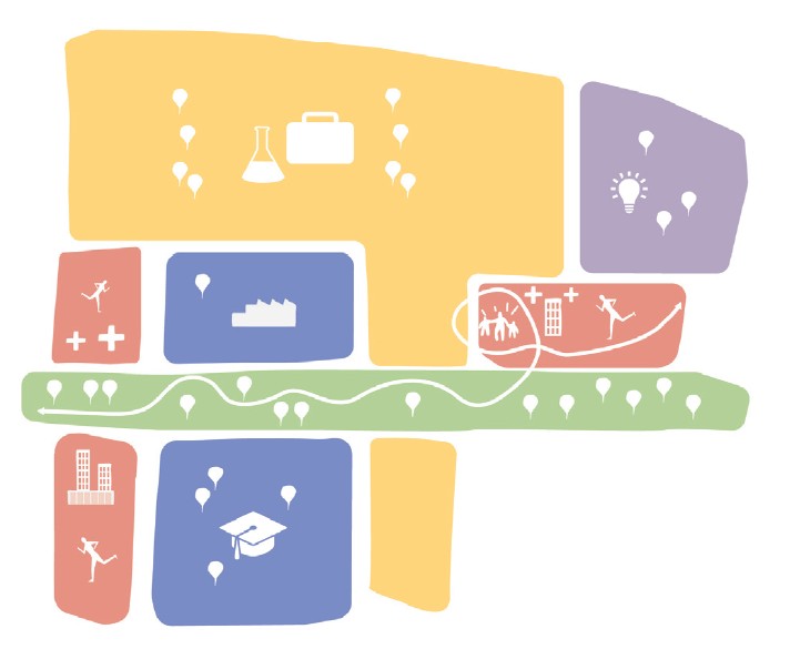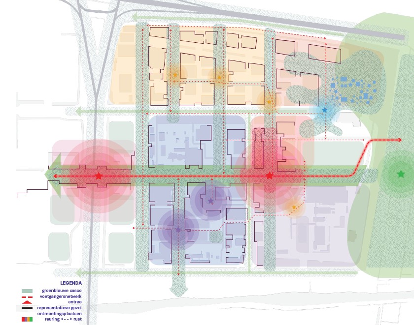 A greater mix of functions, additional amenities and inviting public spaces will encourage interaction and enhance social safety. Squares, parks and active ground floors will make the campus an attractive place to spend time.