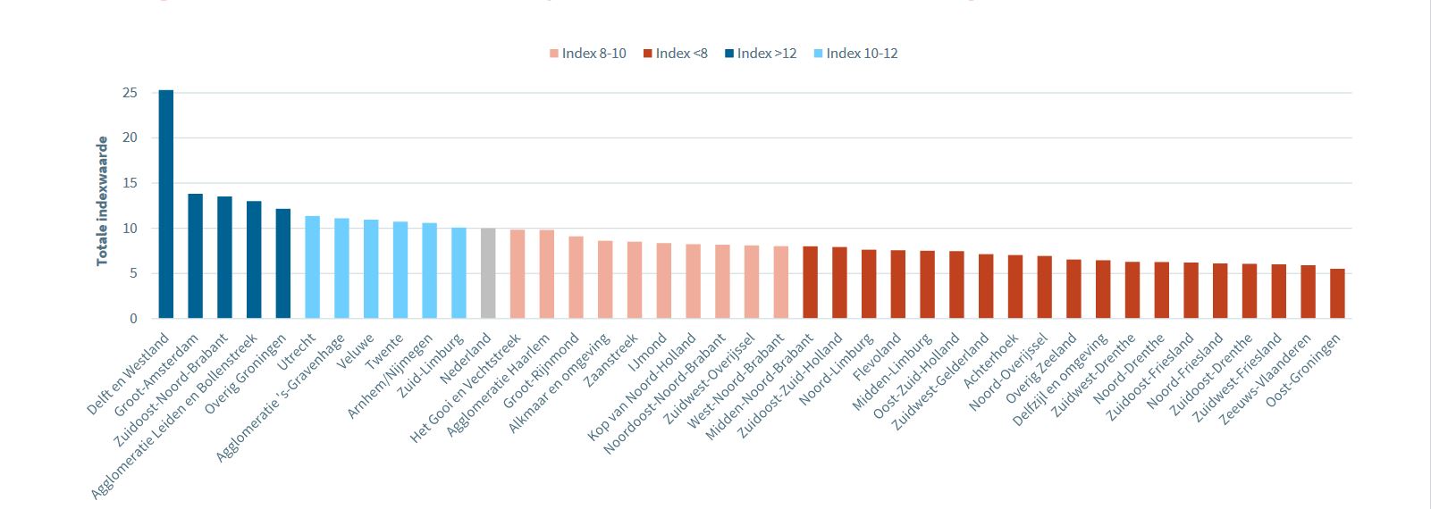 Delft also came out on top in 2022 and 2023, leaving other regions far behind. Key ingredients mentioned in the study are leadership, knowledge and networks that concern the coordination of innovation projects, investments in R&D and the participation of companies in innovation projects.