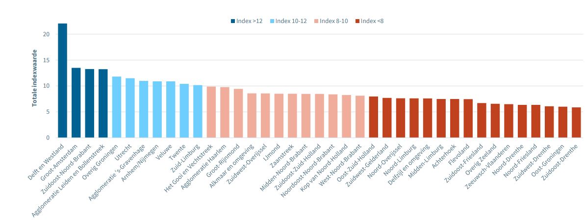 Delft also came out on top in 2020 and 2022, leaving other regions far behind. Key ingredients mentioned in the study are leadership, knowledge and networks that concern the coordination of innovation projects, investments in R&D and the participation of companies in innovation projects.