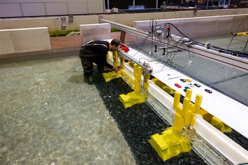 The scale model tests are carried out in two specialised measurement facilities. In Deltares’ Atlantic Basin, a 9 x 75 metre wave and current facility, the influence of waves approaching the barrier perpendicularly and of currents will be measured. In that measurement facility, the barrier will also be subjected to extremely high North Sea water levels, as a representation of possible future situations including sea level rise. These tests are scheduled until mid-January 2025.