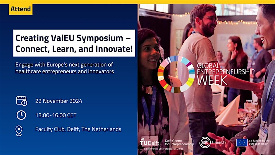 On 22 November 2024, we invite you to the Faculty Club in Delft for an inspiring gathering of healthcare entrepreneurs and innovators from across Europe. This symposium brings together participants of the “Creating ValEU” Innovation Training Course, as well as students and innovators who share a passion for transforming healthcare.