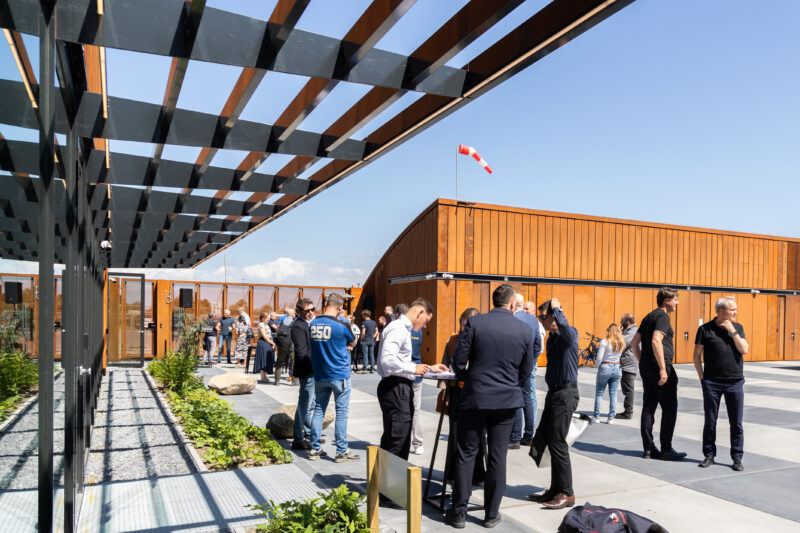 The new building at Heertjeslaan 5 in Delft stands out with its distinctive architecture featuring curved green roofs and a robust appearance, enhanced by the use of corten steel sliding gates. The building is designed with attention to nature and climate. The curved roofs are planted with vegetation that complements the flora and fauna of the surrounding polder landscape. Vegetated, biodiverse embankments make the fencing almost invisible, seamlessly integrating the security boundary with the building and its surroundings.
