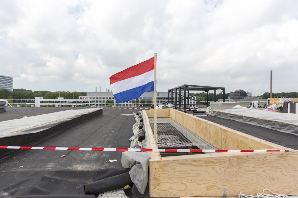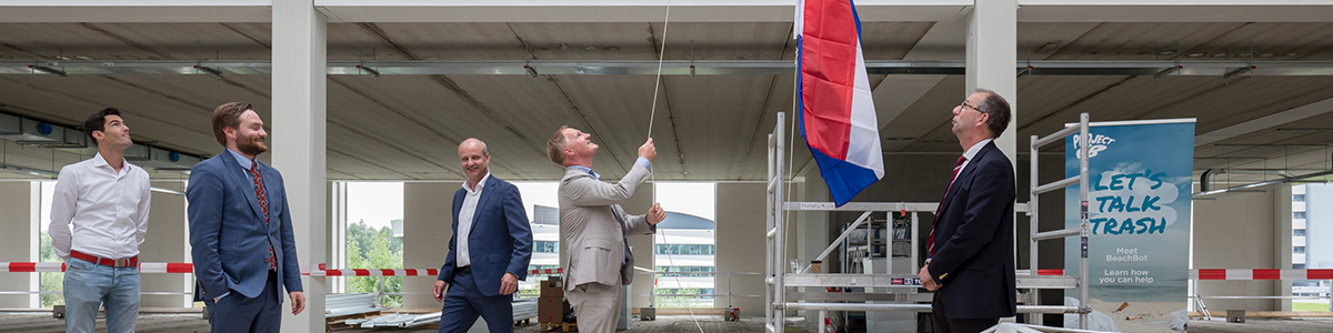 To celebrate the topping out of the new building cepezed, Oldelft Ultrasound and the ASR Dutch Science Park Fund raised a flag in the presence of alderman Bas Vollebregt last Friday, marking this construction milestone. This nature-inclusive circular building, which will provide 3,840 sq. m. of floor space, will be delivered to the ASR Dutch Science Park Fund with a BREAAM ‘Excellent’ certificate at the end of 2020.
