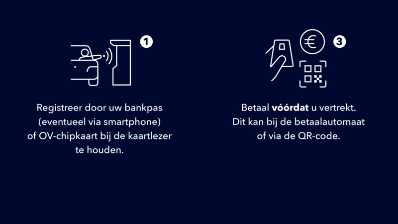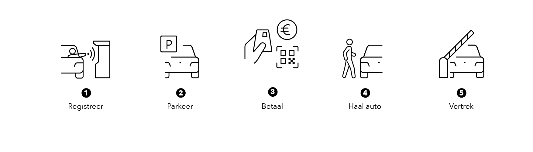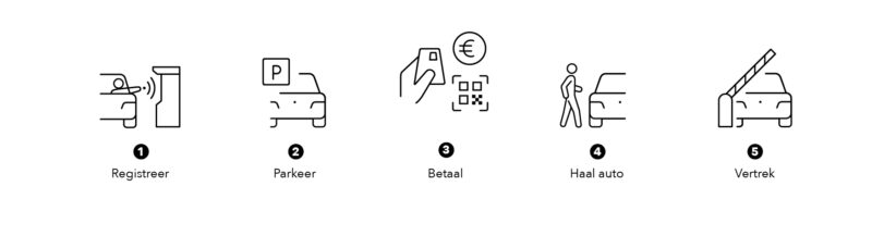 Het parkeersysteem is volledig digitaal (zonder papieren tickets) en werkt als volgt: