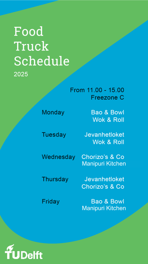 Bij de TU Delft zijn er elke doordeweekse dag van maandag tot en met vrijdag foodtrucks. De foodtrucks bieden een heerlijk en vers assortiment. Je kunt ze vinden op Freezone C van 11:00 tot 14:00 uur. Hier zijn de verschillende foodtrucks die je kunt verwachten: