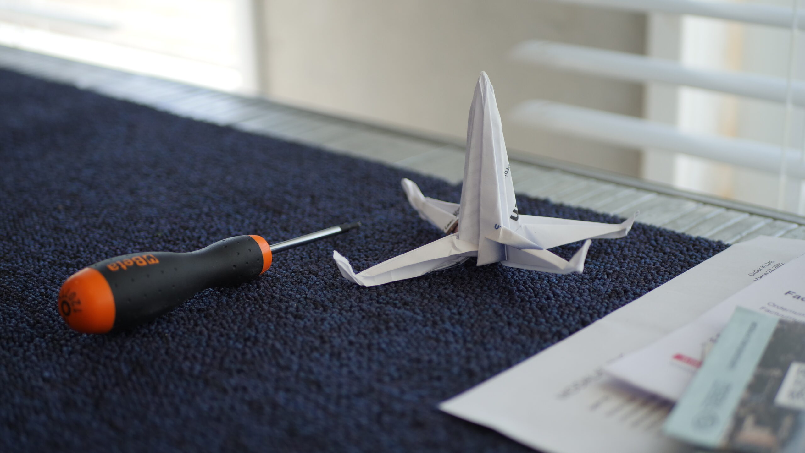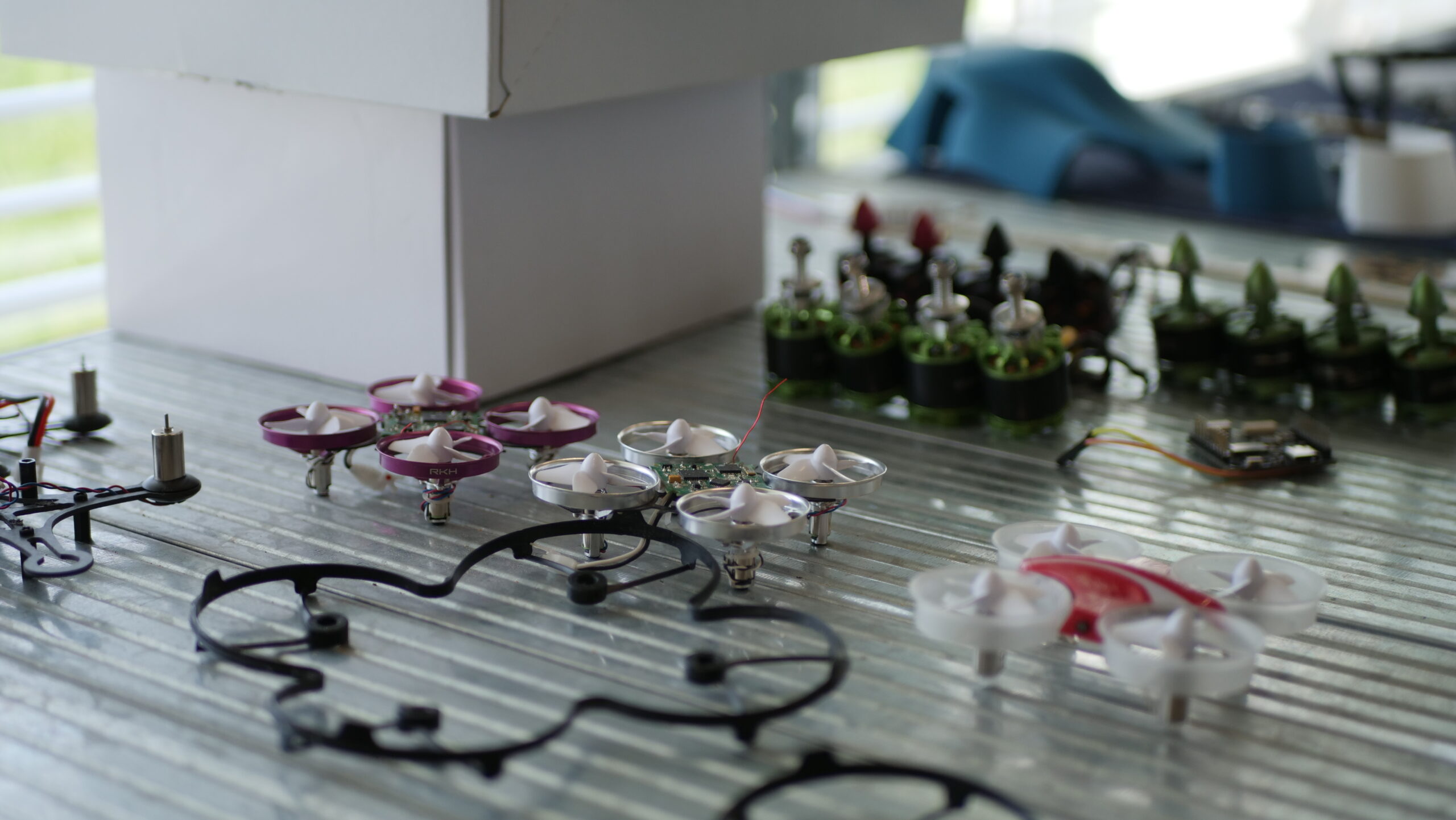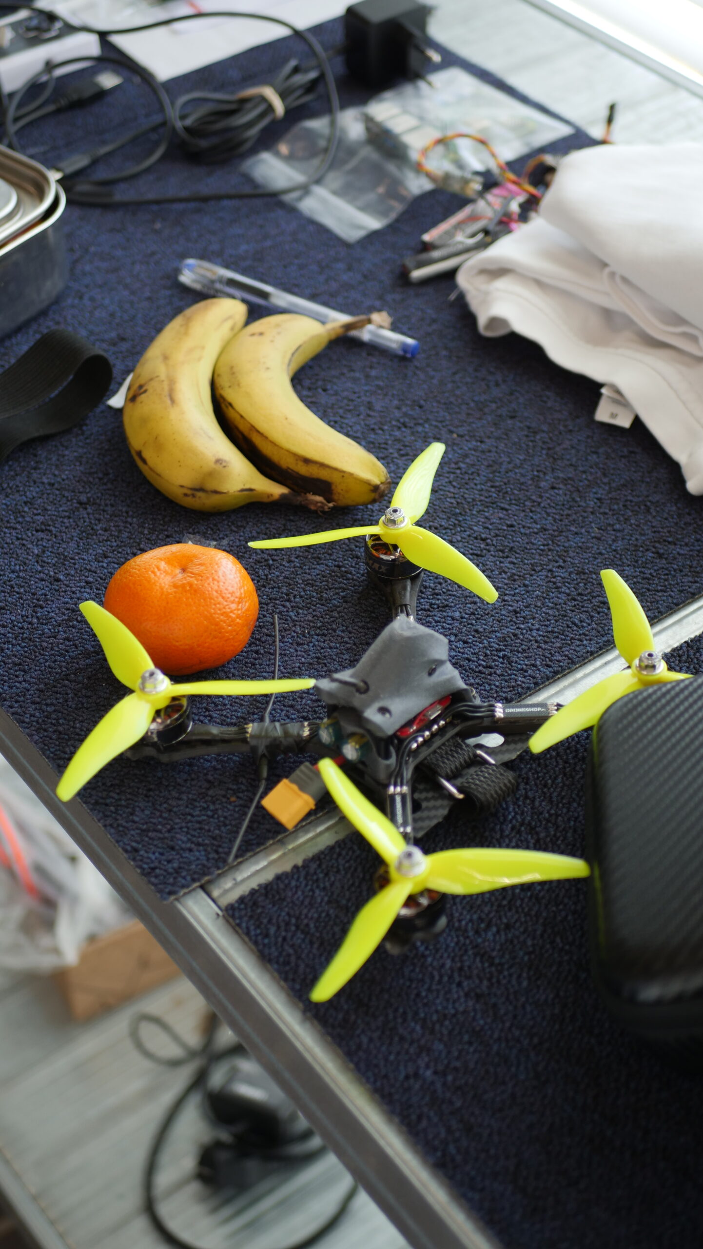 We laten onze ogen rondgaan en zien langs de kamerlange raampartij rijen werkbanken opgesteld. Vooral de hoeveelheid drones, van passend op één enkele hand tot tillen met minimaal twee handen, vallen op. Op het hoge plafond is een rails met daaraan een haak bevestigd te zien, wat verklapt dat de ruimte in het verleden dienstdeed als hangar. Schroevendraaiers, printers, felle lichtjes, propeller origami en losliggend fruit; alles dient een belangrijk nut.