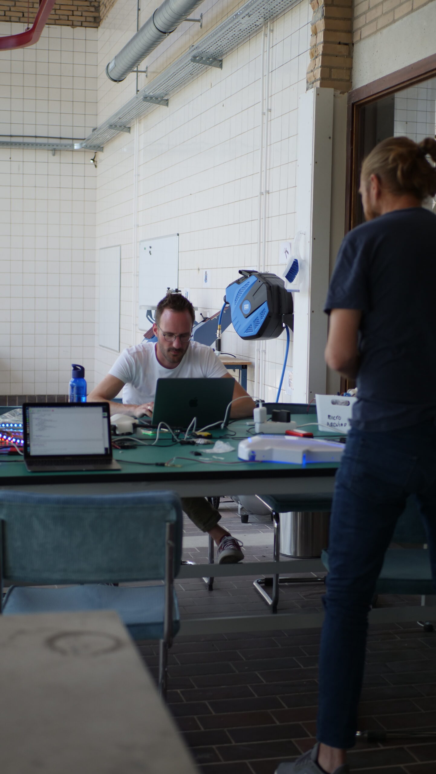 “Kom vooral binnen om een kijkje te nemen, wij klussen hier nog heel even verder”, zegt Walter Kort vanachter een tafel bezaaid met elektronica. Hij is projectmanager van de makerspace binnen UMV en overziet deze ruimte als ‘plek om te maken’.
