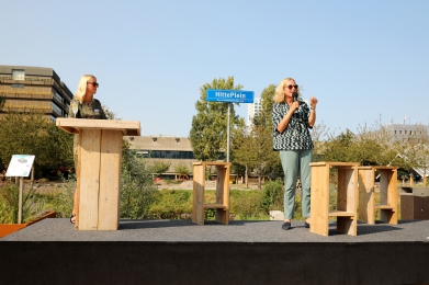 Gedeputeerde Adri Bom-Lemstra: “De komende jaren zullen er ontzettend veel woningen gebouwd worden. Laten we dat meteen goed doen. Klimaatbestendig, zodat mensen niet alleen kunnen wonen, maar gezond en veilig kunnen wonen. Dat is een gedeelde verantwoordelijkheid; van bouwers, overheden, ontwerpers. En het vraagt om innovatieve oplossingen. Het HittePlein gaat ons hierbij helpen, een plek waar we nieuwe innovatieve oplossingen fysiek kunnen uitproberen en laten zien. Dat levert niet alleen kennis op, maar ik hoop dat het ook partijen bij elkaar brengt. Samen maken we het verschil.”