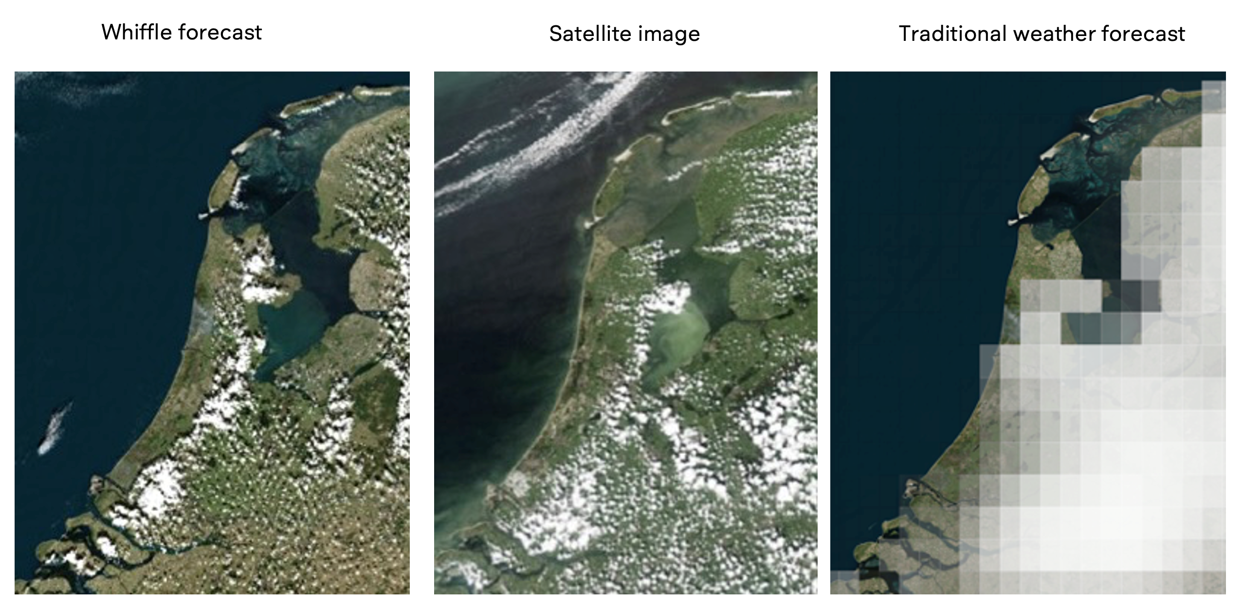 Aan de hand van een rijtje kaarten laat Jonker zien wat Whiffle’s modellering zo bijzonder maakt. Traditionele weersvoorspellingen werken met een raster van blokken van 10 km x 10km. Satellietbeelden laten in de wolkenvelden al meer relevant detail zien. In Whiffle’s model wordt gewerkt met een raster van blokjes van 100m x 100m. Een gigantische sprong in detail en informatiedichtheid ten opzichte van traditionele weersvoorspellingen.