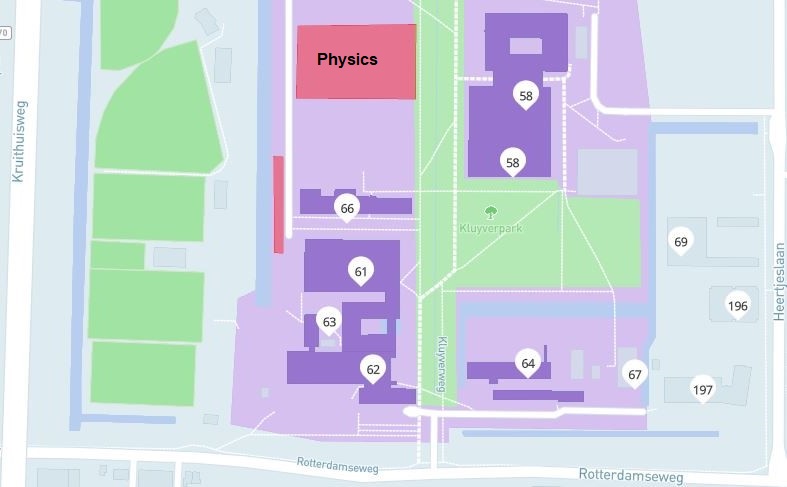 Physics will be located on the former site of Chemicals & Gases, which has been relocated to a new building within the same area. The newly available plot complies with the appropriate VC-F vibration requirement and the EMC requirements for research conducting by the faculty of Applied Sciences. This location has the added advantage that it will bring the faculty of Applied Sciences closer to three other Applied Sciences buildings. The new building will be directly adjacent to the buildings that currently houses Molecular and Life Sciences (building 58), the Catalyses Lab (building 67) and to the reactor institute (building 50).