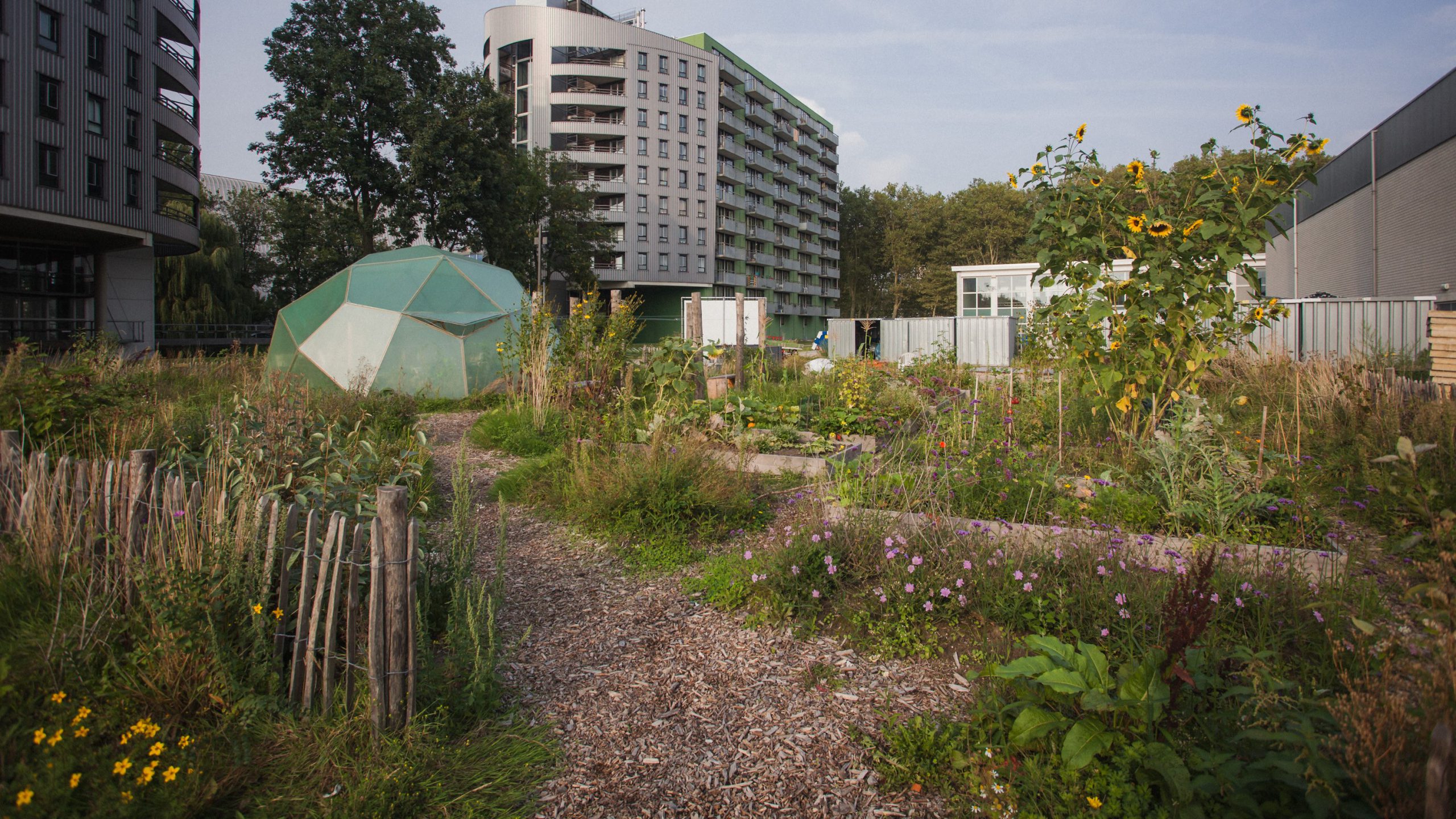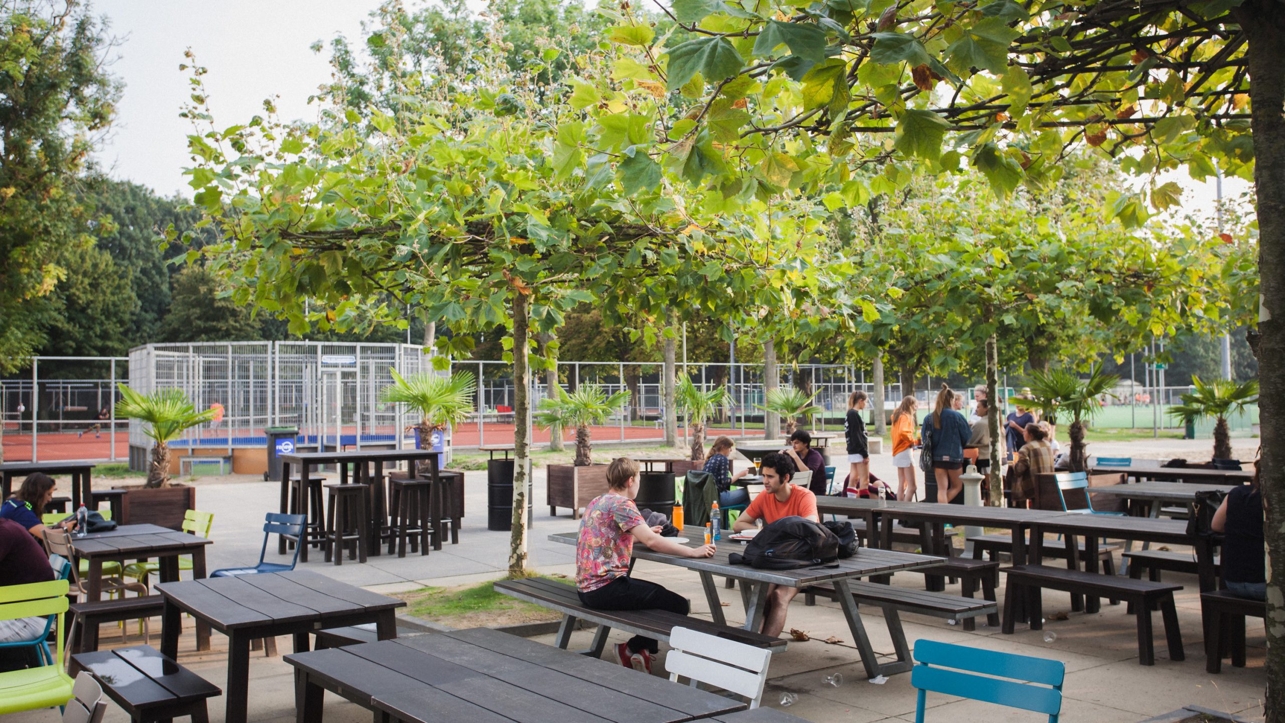 More greenery was also added to the sides of the building, for a relaxed atmosphere in contrast to the liveliness at Café X. New, large benches along the tennis courts now form a quiet place to meet and enjoy the sun. On the opposite side, near the student residences, the grounds were also upgraded and became more attractive. The area for the Campus Farm has become much larger. Containers have also been placed here to store materials used by X. A new, central collection station for all wheelie bins ensures an orderly appearance and facilitates good accessibility for the waste collection services.