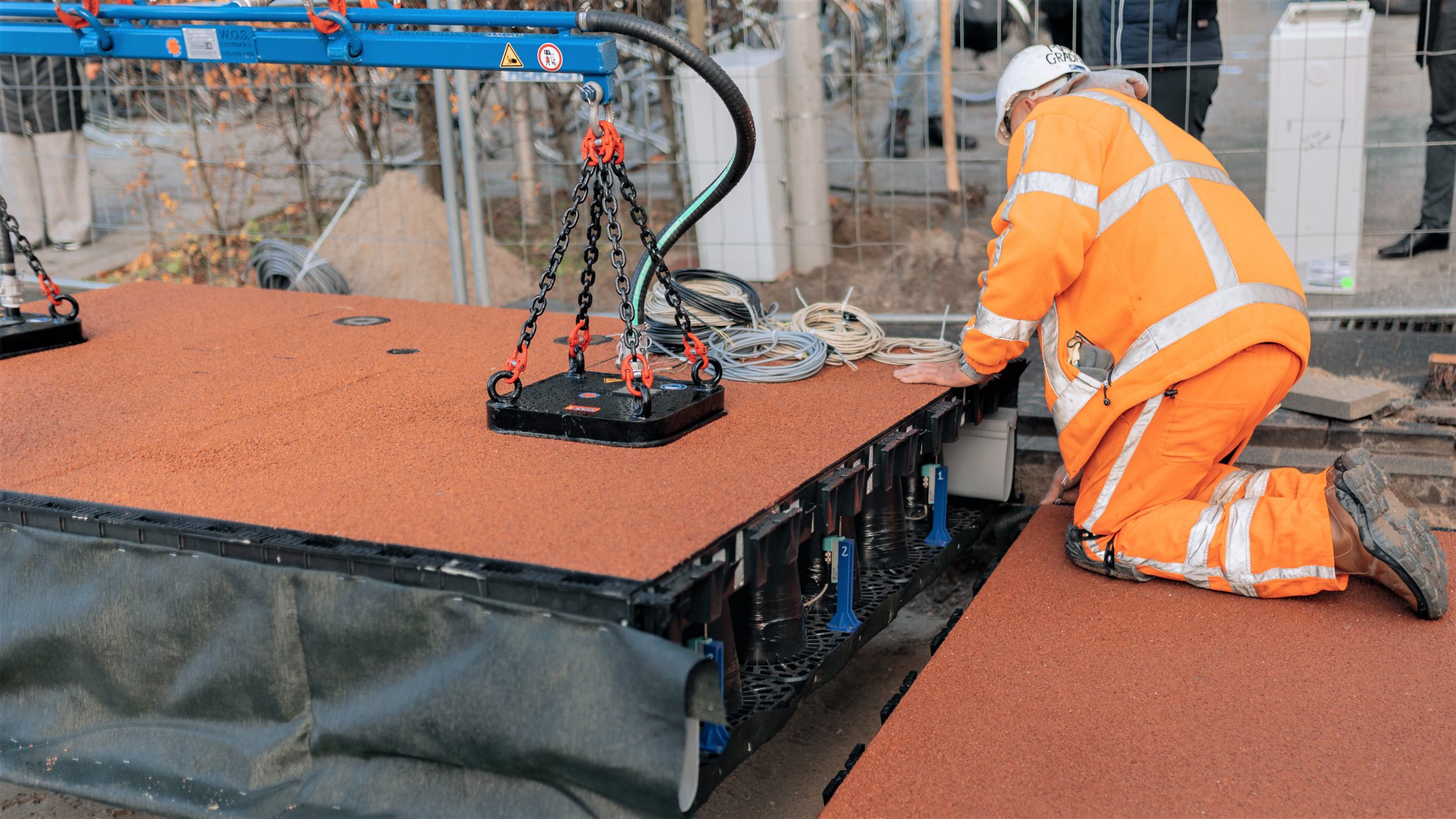 The intelligent bicycle lane, stretching 25 meters, consists of sustainable and circularly developed elements made of recycled household plastic waste. The integrated hollow space serves as a temporary reservoir for rainfall, ideal for making cities more climate proof. Eric Kievit, director of PlasticRoad: ‘Roads that understand their usage – the kind of traffic and rainfall they accommodate, and that can communicate with other platforms such as traffic lights, public lighting, dynamic wayfinding, maintenance planning and sewage systems – are the future. Thanks to this unique collaboration, we will come ever closer to a world in which layout design of cities is both smart and efficient, with sustainable traffic management. As PlasticRoad, we are proud to significantly contribute to this unique project.’