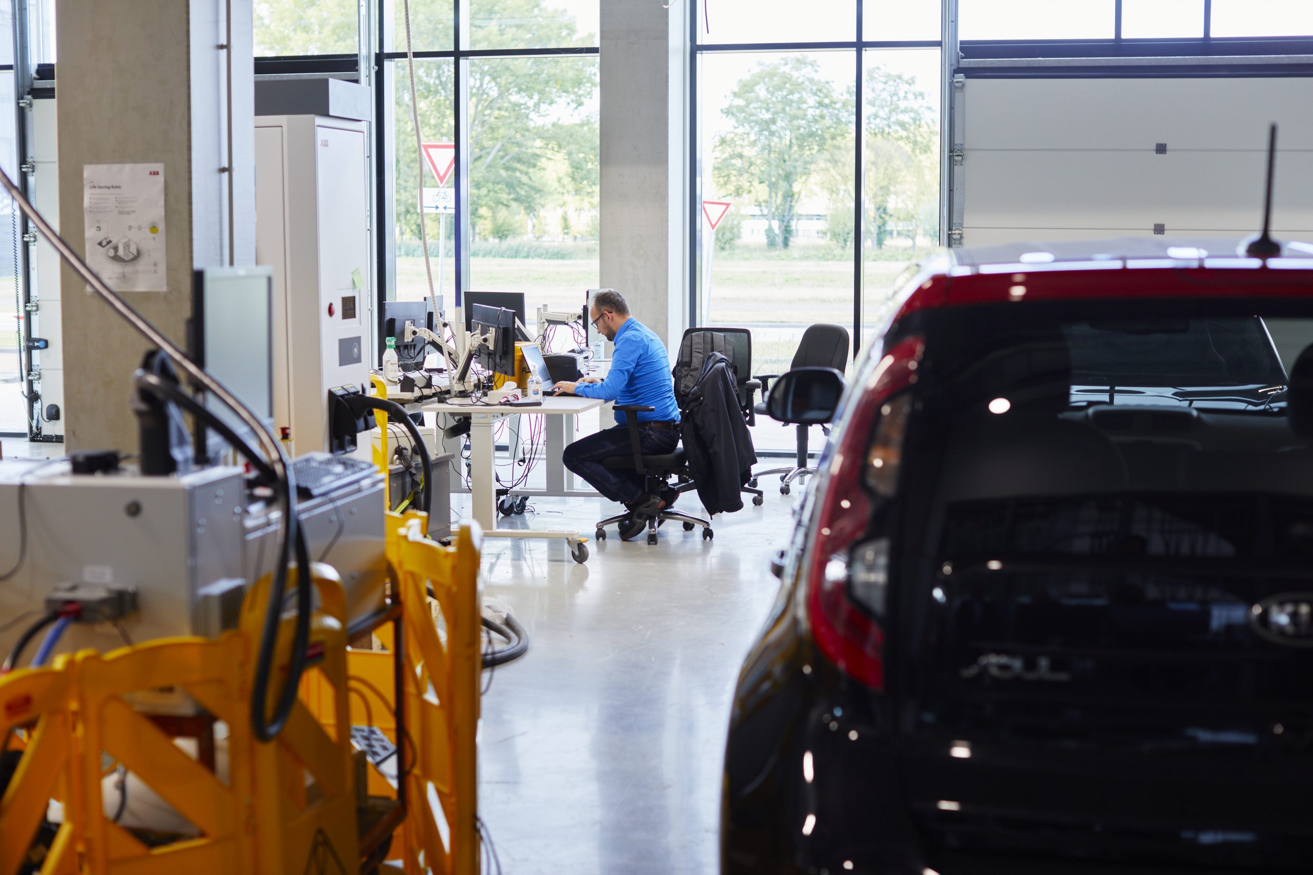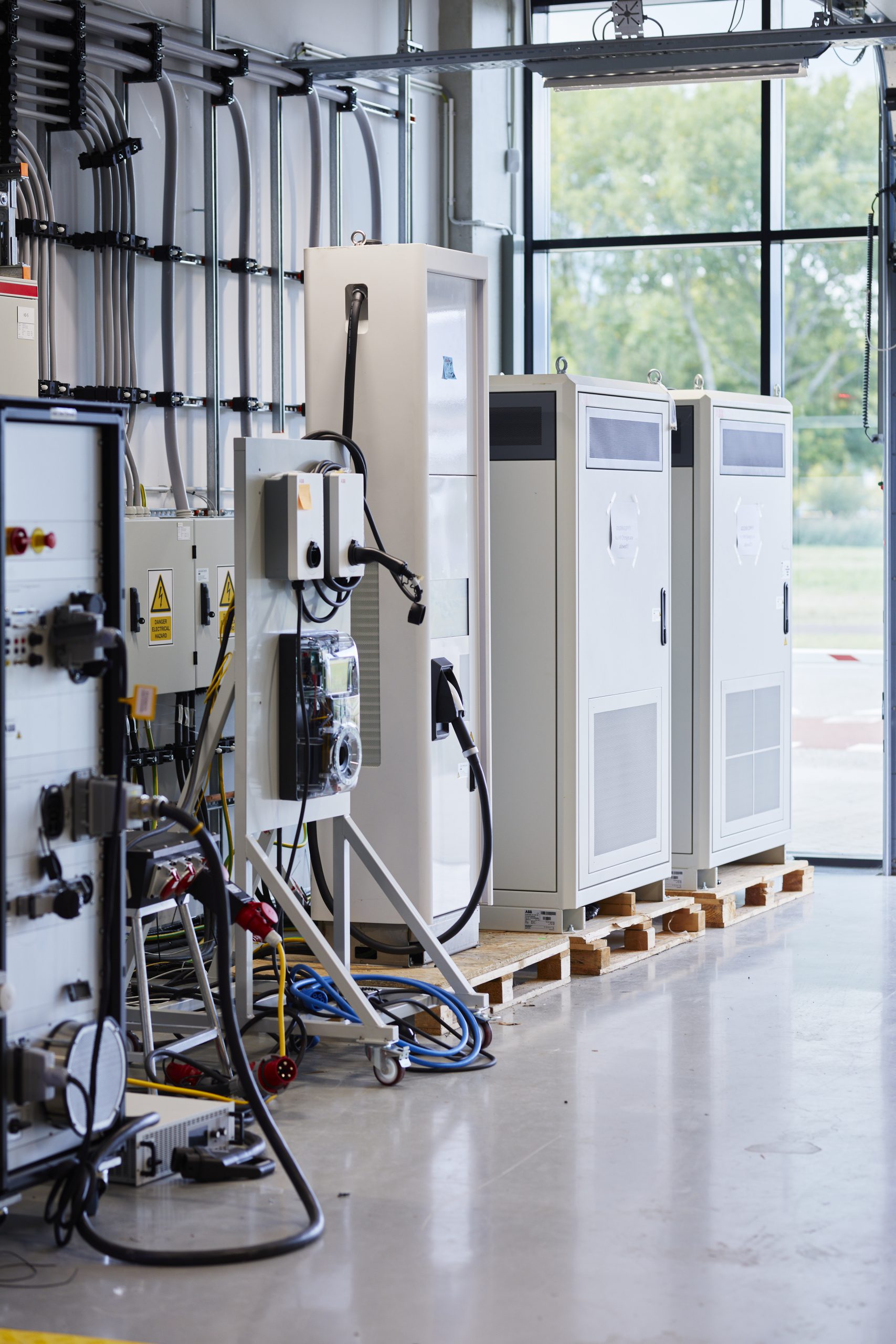 An electric bus is parked outside under an enormous rapid charger. A gigantic electric truck is parked inside. In another area, an electric BMW and Porsche are parked next to a brand-new Terra 360: the fastest charger in the world. A red light on the doors to the climate chambers, which are used for testing at temperatures of -40 to +70 degrees, indicates that they are engaged. Welcome to the ABB E-mobility Innovation Lab: the new ABB building on the TU Delft Campus, where smart charging systems and infrastructures are being developed to facilitate the growth of electric transport.