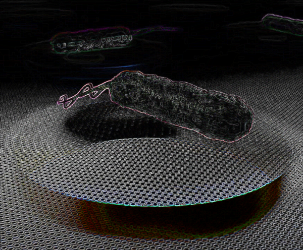 An artistic depiction of a single bacterium on a graphene membrane